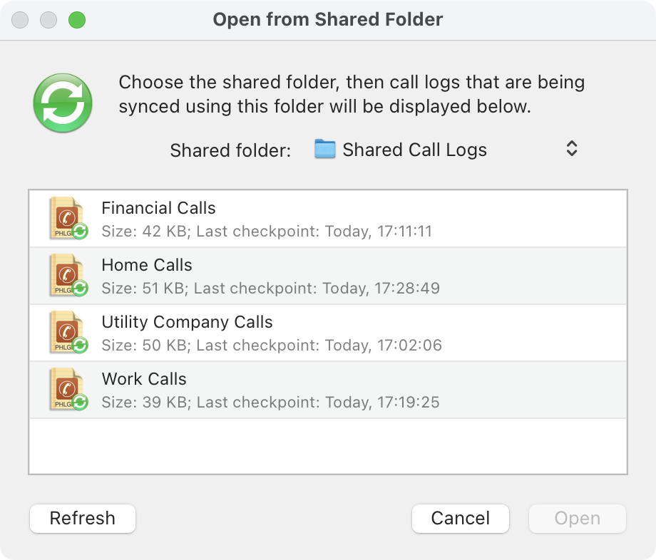 Once a call log has been set up to sync, it can be opened on another Mac. Use the "Open from Sync Server", "Open from Shared Folder" or "Open from Dropbox" options in the File menu and select from the available logs given.