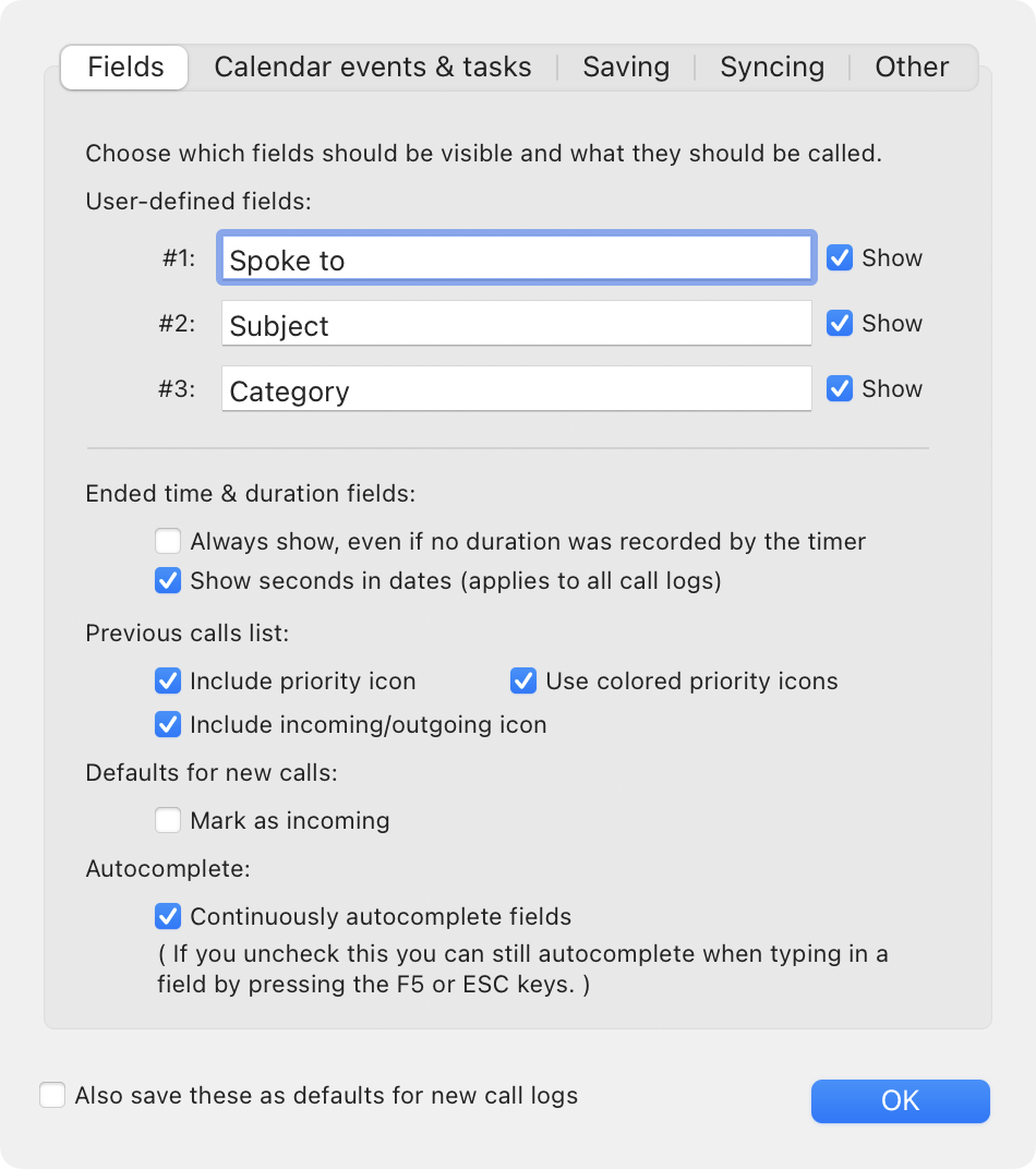 Use the first tab to change the names of certain fields and control whether they are visible; change the way calls are displayed in the call list; and control whether autocomplete is continuous as you type or only invoked when you press F5 or ESC.