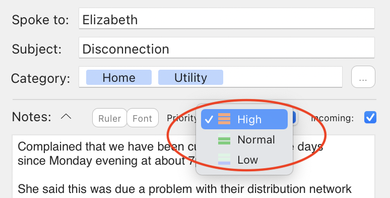 Tick the Incoming checkbox when you are recording details about a call you received, rather than a call you were making. Icons in the call list allow to easily see which calls are high priority or which are incoming rather than outgoing.
